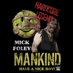 Ladies and gentlemen, children of all ages, from the world of wrestling sports entertainment and one of the most famous wrestling competitions in the world, the WWE proudly brings you this Mick Foley Mankind Have a Nice Day Men’s Tee featuring a distressed graphic of Mick Foley Mankind wrestler with a happy face wearing his popular mask with his catchphrase “Have a nice day!” printed below in yellow. Grab this tee and show your love for the amazing sport of wrestling!