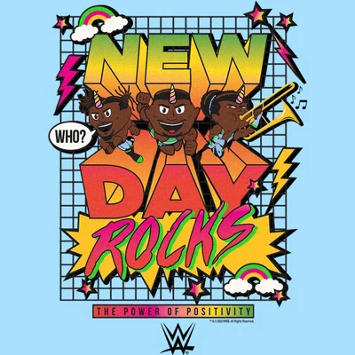 - Strut your stuff with this stylish new men’s t-shirt that is perfect for every occasion! Featuring a cartoon version of the wrestling trio along with bold rainbow-colored text that reads: “New Day Rocks the Power of Positivity.”