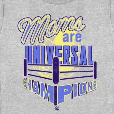- Grab something special for this Mother’s Day with this women’s t-shirt featuring the phrase: “Moms Are Universal Champions” across the front in the form of a wrestling ring.